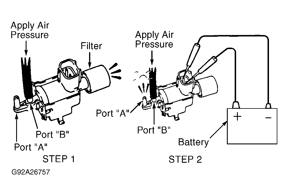 - Disconnect hoses from vacuum tank. Vacuum tank is located near driver's side front corner of engine compartment, below battery tray. Apply air pressure to port "B" on vacuum tank. Ensure air flows from port "A". Perform STEP 1. See Fig 2. Apply air pressure to port "A". Ensure air does not flow from port "B". Perform STEP 2. See Fig 2.