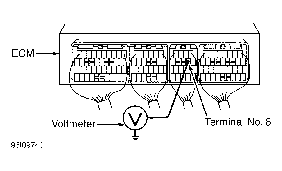 - If intake air control valve VSV is okay, reinstall VSV. Remove glove box for access to Engine Control Module (ECM). Turn ignition on. Using voltmeter, check voltage between terminal No. 6 (Red/Yellow wire) on ECM and chassis ground. See Fig 5.