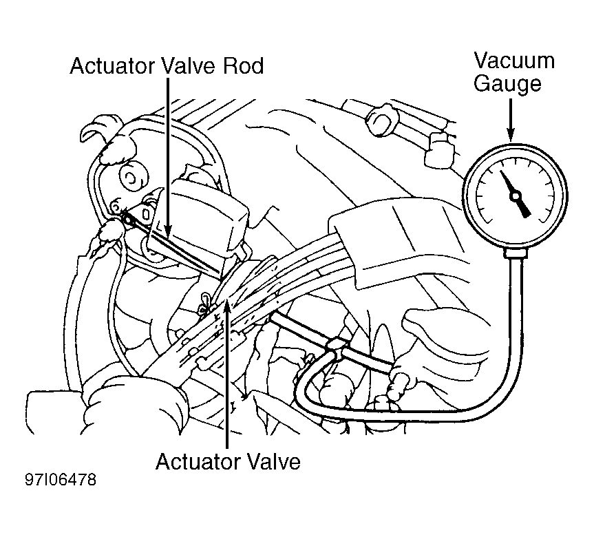 - Disconnect vacuum hose from actuator valve. Using vacuum pump, apply 8 in. Hg of vacuum to actuator valve. Ensure actuator valve rod pulls inward and remains pulled inward for at least one minute. Replace actuator valve if defective. If actuator valve operates correctly, reconnect vacuum hose. Proceed to next step.