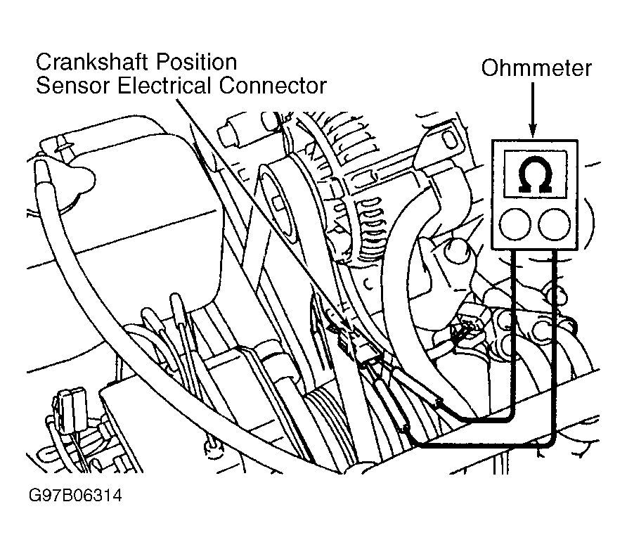 - Using ohmmeter, check resistance between electrical terminals on crankshaft position sensor. Replace crankshaft position sensor if resistance is not within specification. See DISTRIBUTORLESS TYPE IGNITION SYSTEM CRANKSHAFT POSITION SENSOR RESISTANCE table. Reinstall electrical connector.