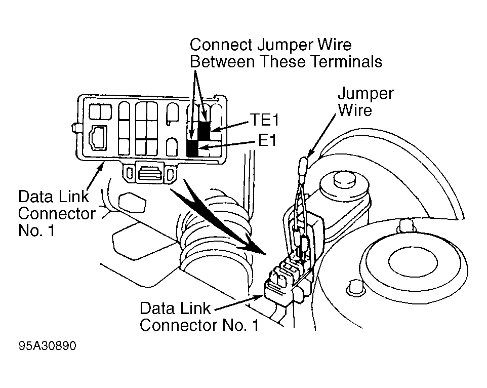 - Install Jumper Wire (SST 09843-18020) between terminals TE1 and E1 on data link connector No. 1. See Fig 2. Data link connector No. 1 is located near driver's side strut tower.