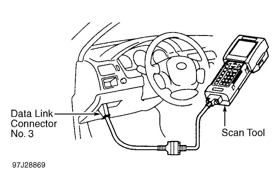 - Install scan tool on data link connector No. 3. See Figure. Turn ignition on. DO NOT start engine.