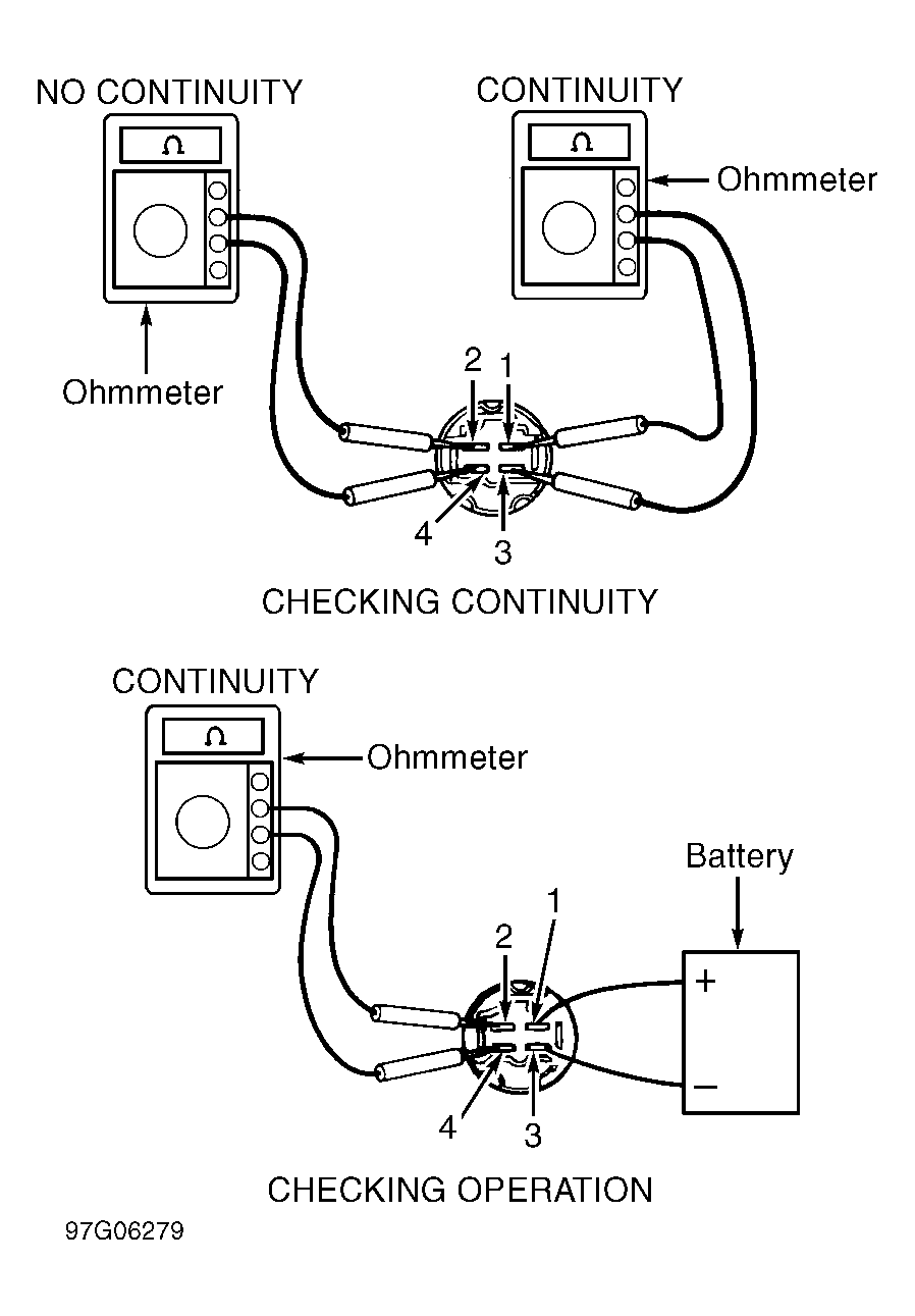 3. To check EFI main relay operation, apply battery voltage and ground to relay and use ohmmeter to check continuity between specified terminals. See Fig 1. Replace EFI main relay if defective.