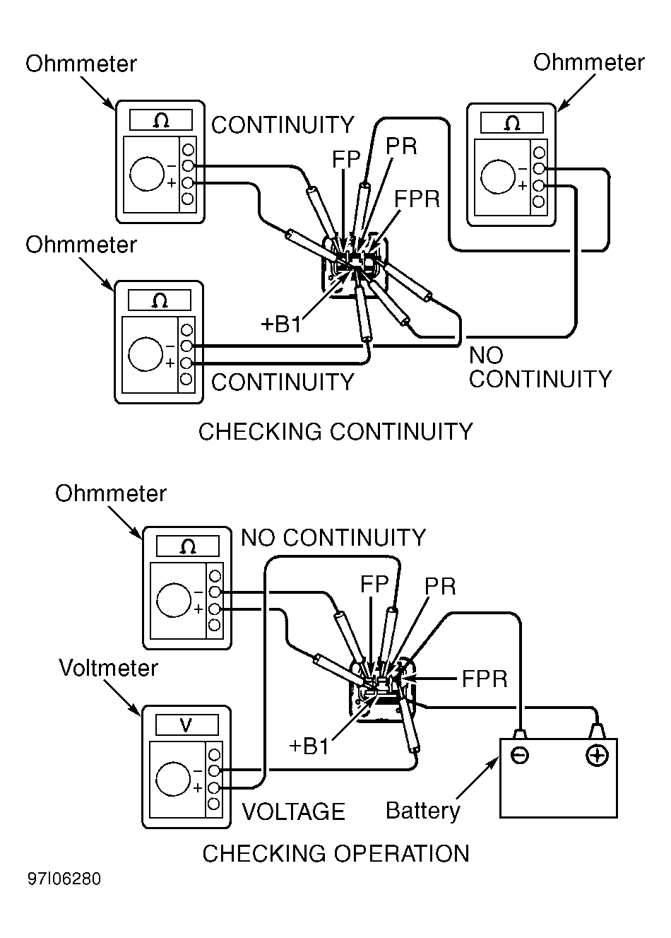 - To check fuel pump relay continuity, use ohmmeter to check continuity between specified terminals. See Fig 2. Continuity should exist between terminals +B1 and FPR, and terminals +B1 and FP. No continuity should exist between terminals +B1 and PR.