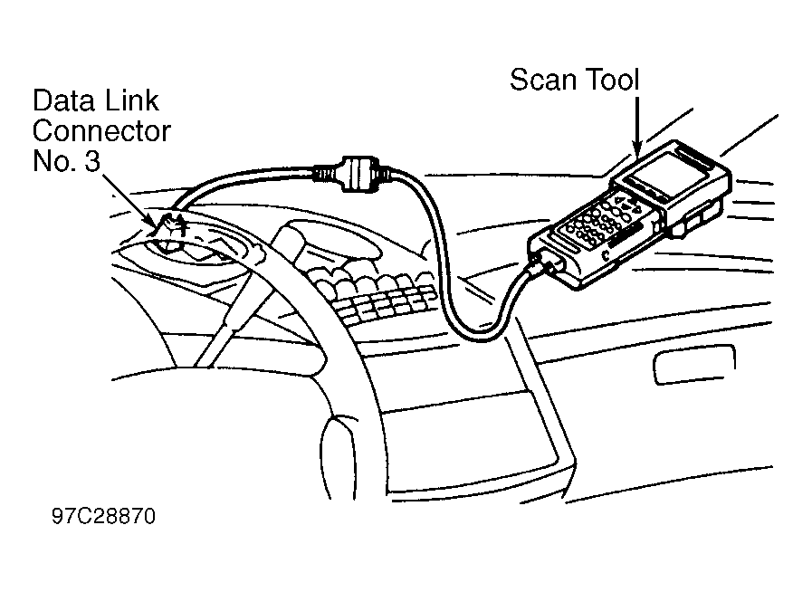 - Remove cover (if equipped) and connect scan tool to data link connector No. 3. See Fig 1. Turn ignition on. DO NOT start engine.