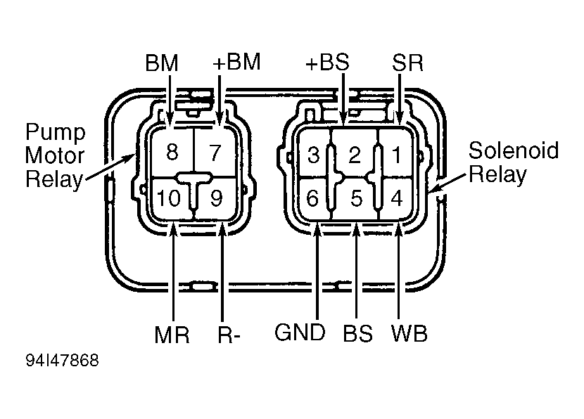 - Remove ABS control relay. See Figure. Using DVOM, ensure continuity is present between relay terminals No. 9 and 10. See Figure. Ensure continuity is not present between relay terminals No. 7 and 8. Replace relay if continuity is not as specified.