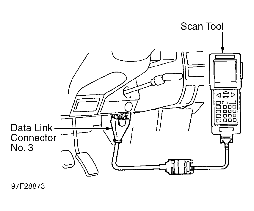 - Remove cover (if equipped) and install scan tool on data link connector No. 3. See Figure. Turn ignition on. DO NOT start engine.