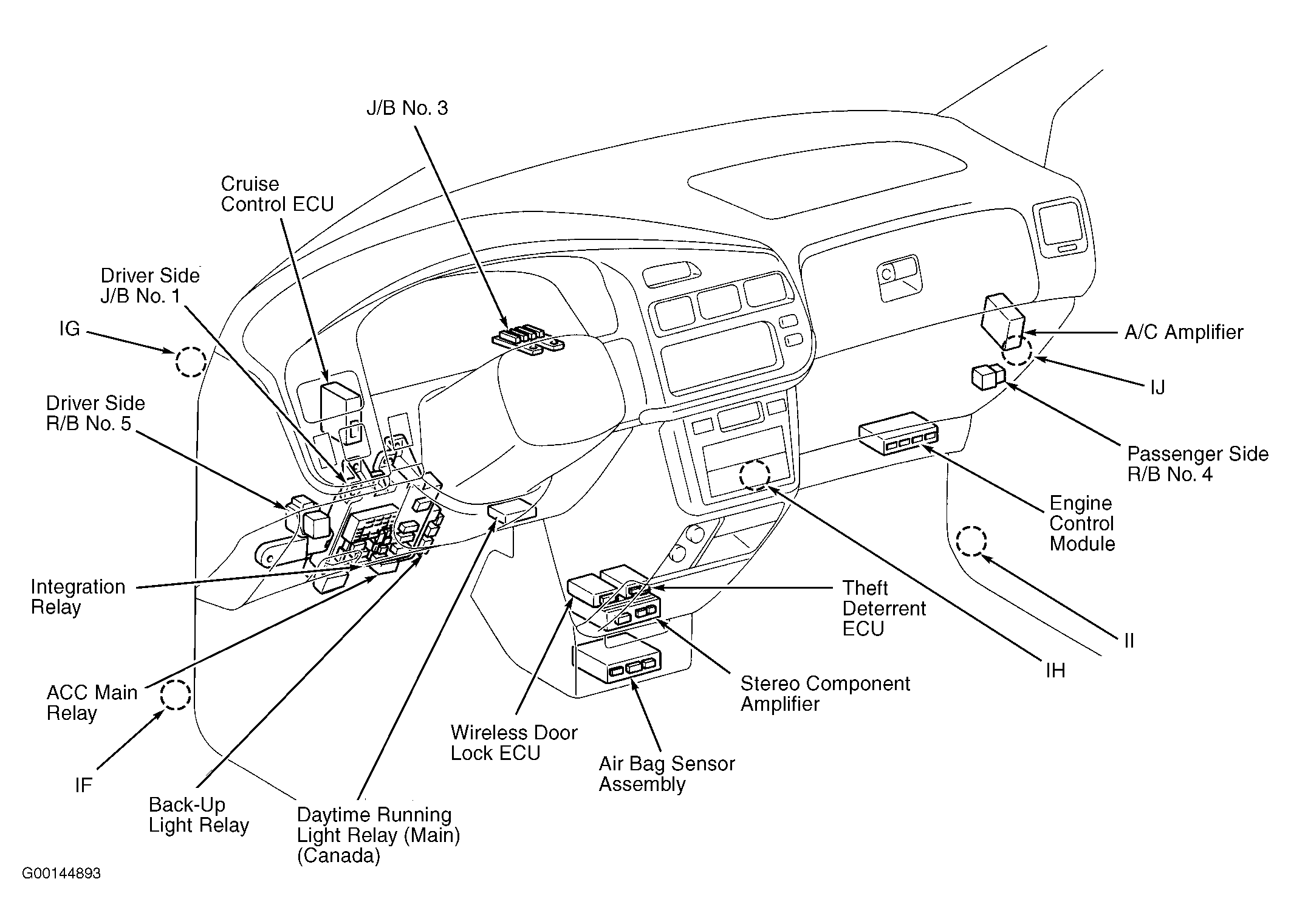 | Theft Deterrent ECU | Below center of dash. See Figure. |