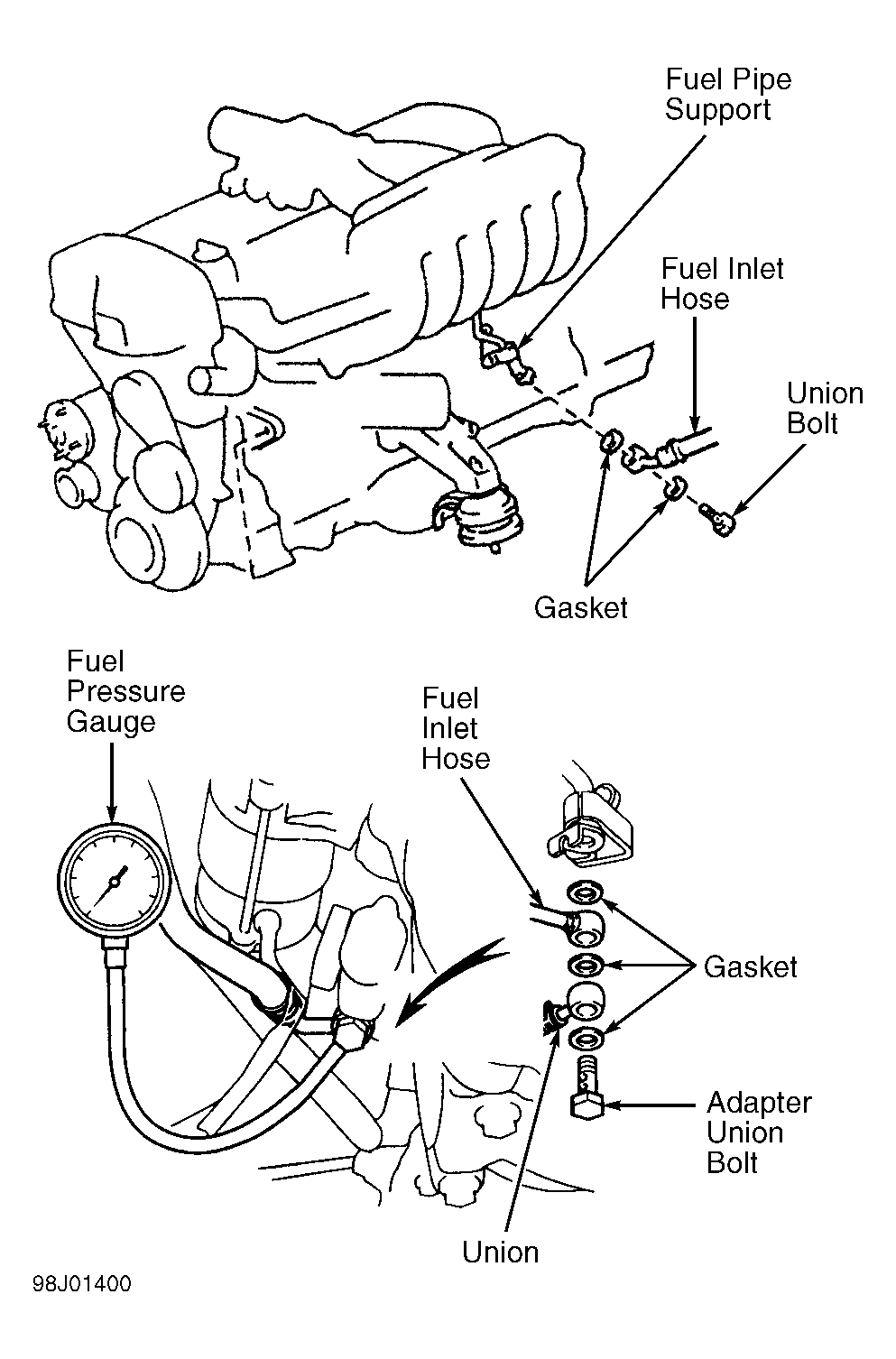 - Release fuel pressure. Disconnect negative battery cable. Remove adapter union bolt, union and fuel pressure gauge. Reinstall fuel inlet hose on fuel pipe support using NEW gasket. Tighten union bolt to 21 ft. lbs. (29 N.m). Install negative battery cable. Check for fuel leaks by using scan tool to energize fuel pump.