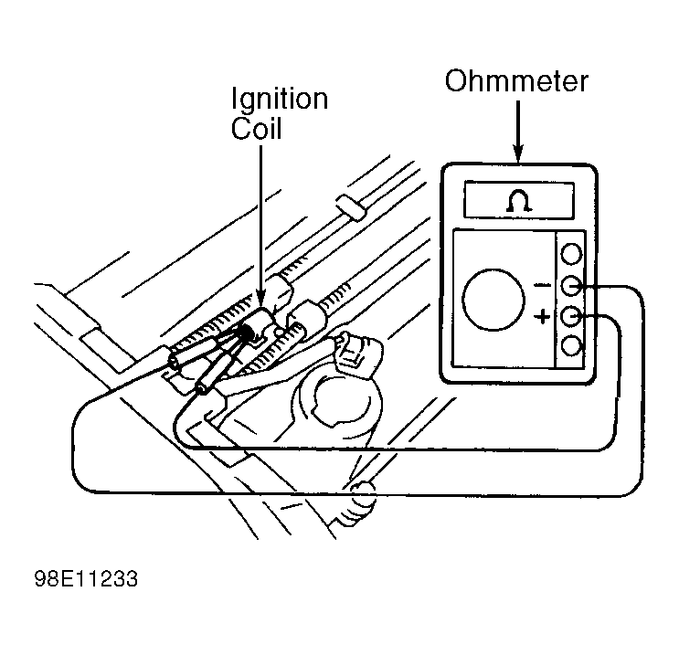 - Disconnect electrical connector from ignition coil. Using ohmmeter, check ignition coil primary resistance between positive (+) and negative (-) electrical terminals on ignition coil. See Fig 1.