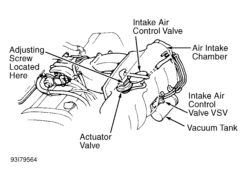 - Disconnect electrical connector from intake air control valve Vacuum Switching Valve (VSV). Intake air control valve VSV is located near vacuum tank. See Fig 1. It may be necessary to remove vacuum tank for access to intake air control valve VSV.