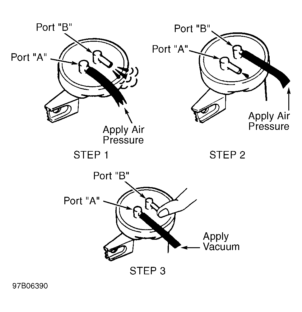 - Disconnect vacuum hoses from vacuum tank. Vacuum tank is located below air intake chamber. See Fig 1. Apply air pressure to port "A" on vacuum tank. Ensure air flows from port "B". Perform STEP 1. See Fig 2. Apply air pressure to port "B". Ensure air does not flow from port "A". Perform STEP 2. See Fig 2.