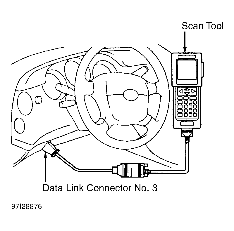 - Connect scan tool to data link connector No. 3. See Figure. Scan tool is used to monitor engine RPM.