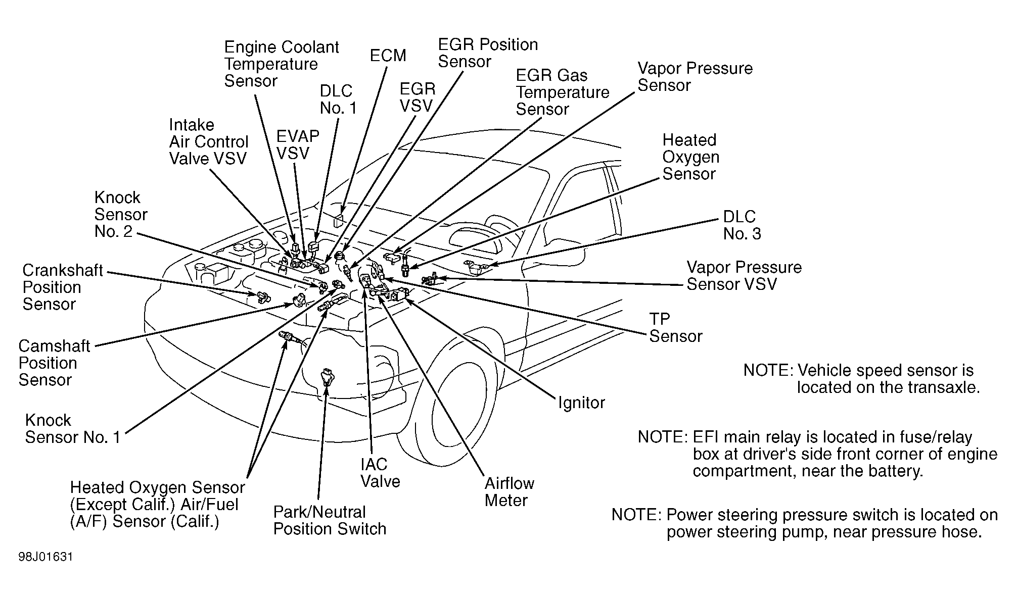 Engine control system is a computerized emission, ignition and fuel injection control system. Engine control system lowers exhaust emissions while maintaining good fuel economy and driveability. Engine control system consists of various sensors, switches and control units. See Fig 1-23. An Engine Control Module (ECM) controls engine control system based on input signals received from various input devices. The ECM contains preprogrammed data to maintain optimum engine performance under all operating conditions.