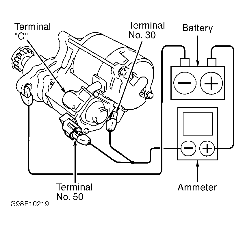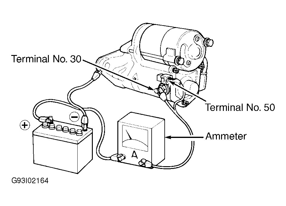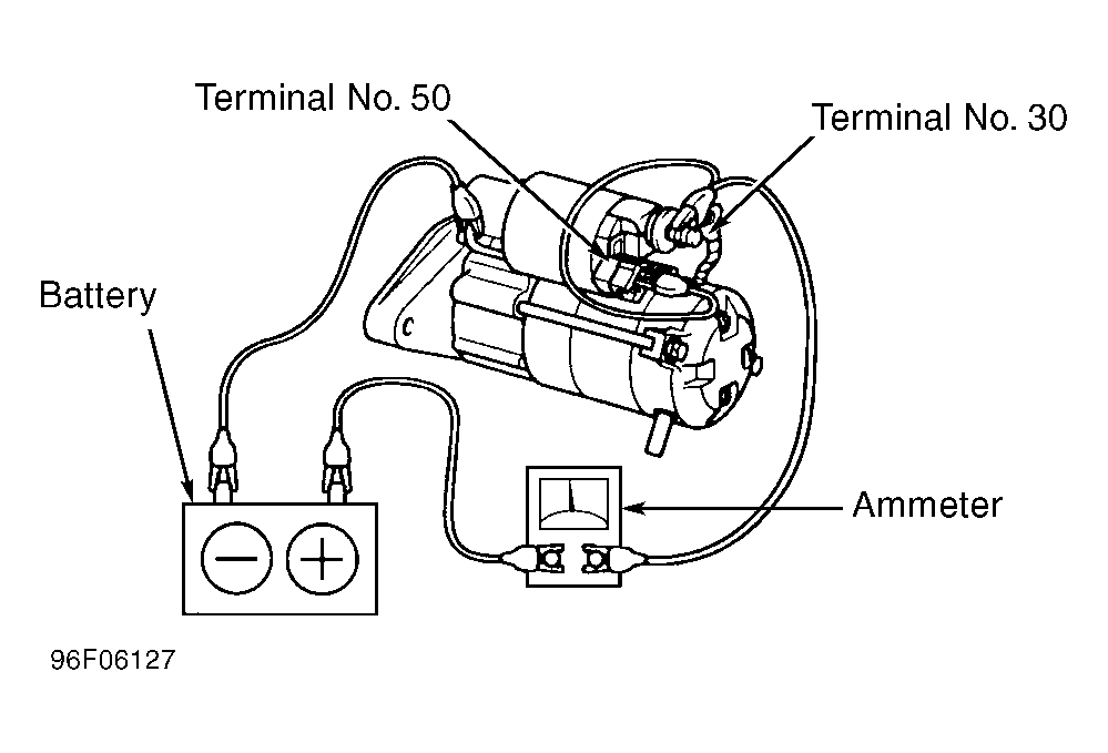 1. Remove starter. Connect ammeter in series between starter motor terminal No. 30 (battery terminal) and a fully charged 12-volt battery. Connect battery negative to starter case ground. See Fig 1, Fig 2 or Fig 3 . Connect voltmeter to battery to observe voltage draw readings.