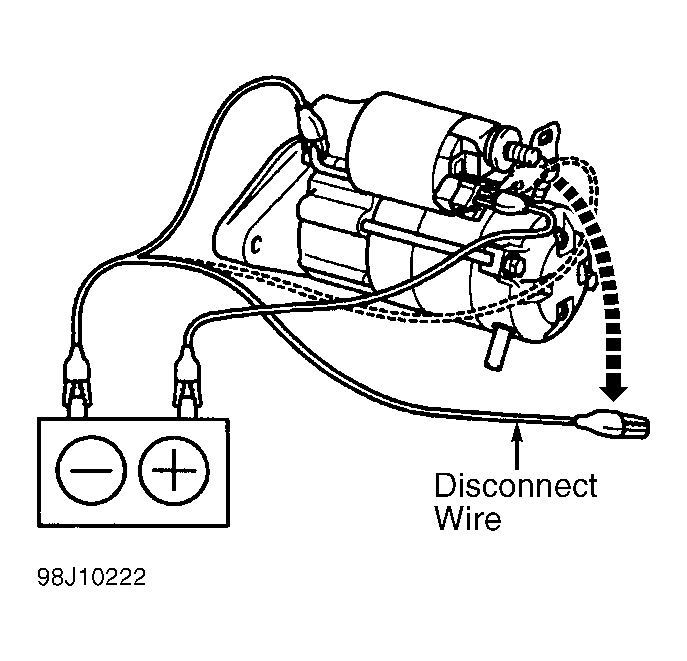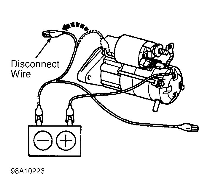 Disconnect jumper wire from negative battery terminal to starter housing. See Figure, Figure or Figure . Pinion gear should now retract. If it does not retract, replace solenoid.