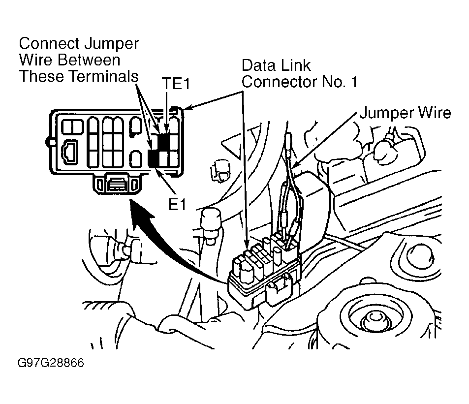 - Install Jumper Wire (SST 09843-18020) between terminals TE1 and E1 on data link connector No. 1. See Figure-37. Data link connector No. 1 is located on timing belt end of engine, just above the generator.
