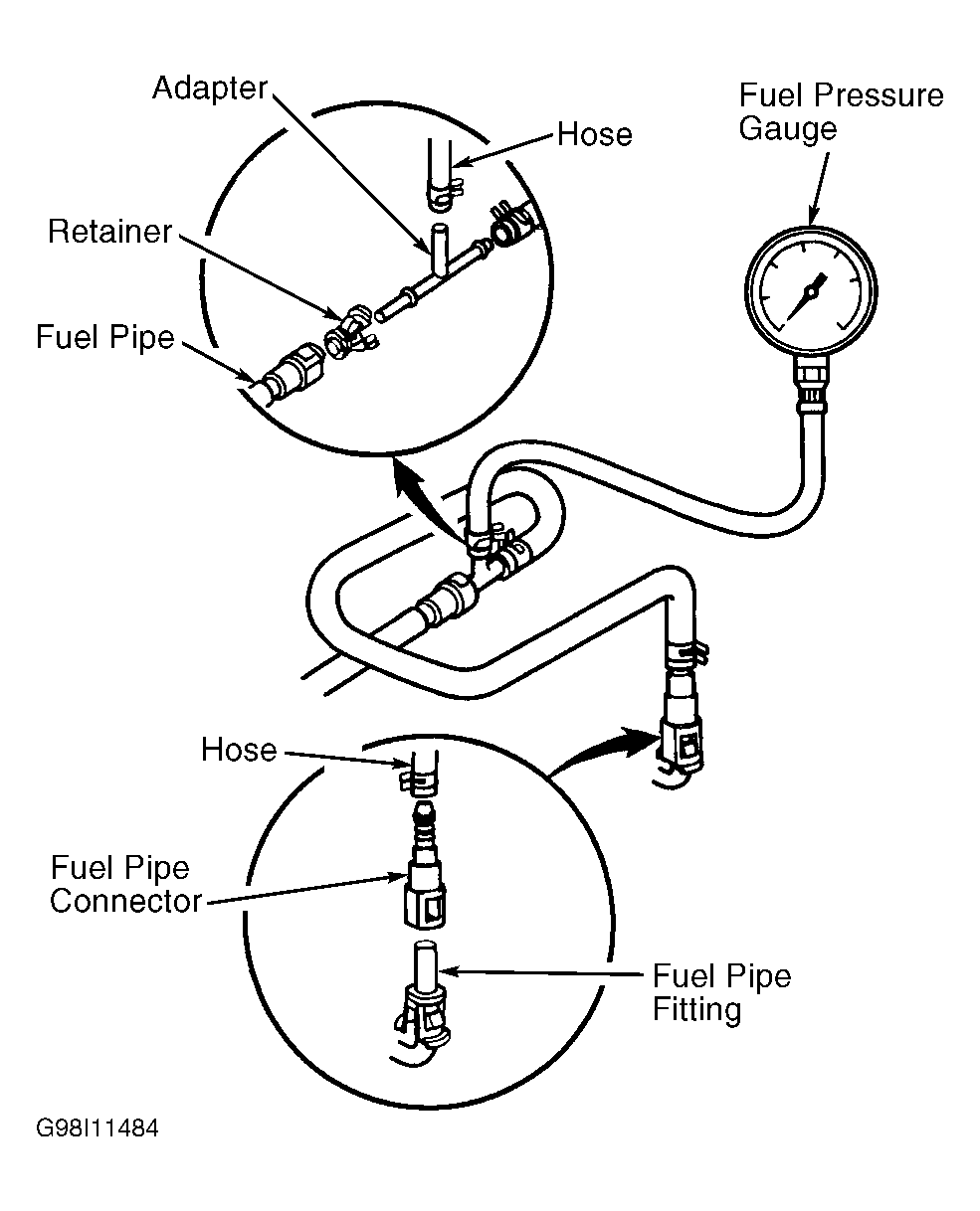 11. Release fuel pressure. Disconnect negative battery cable. Remove adapter, hose, fuel pressure gauge and fuel pipe connector.