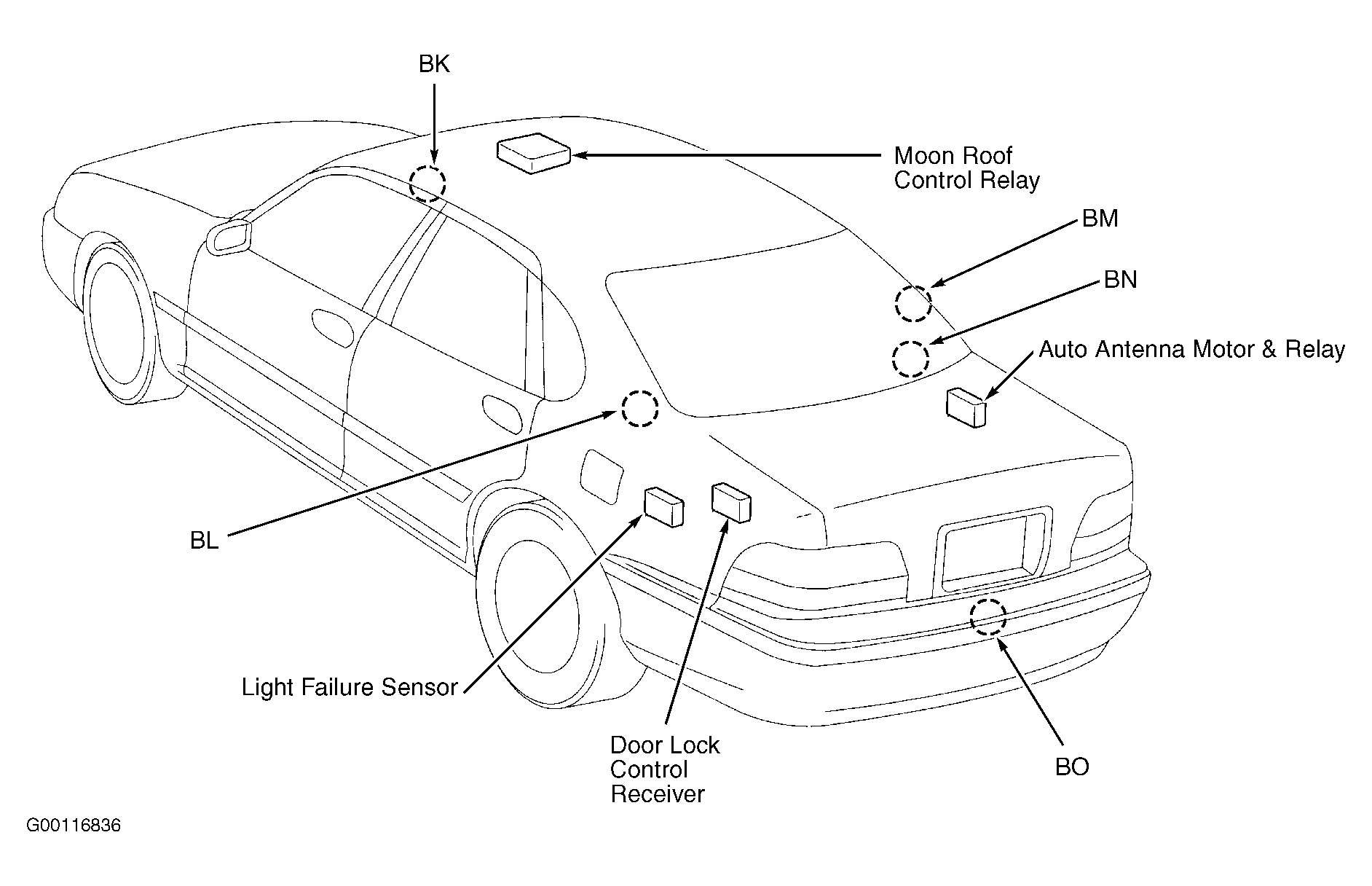 | Door Lock Control Receiver | On left side of trunk. See Figure. |