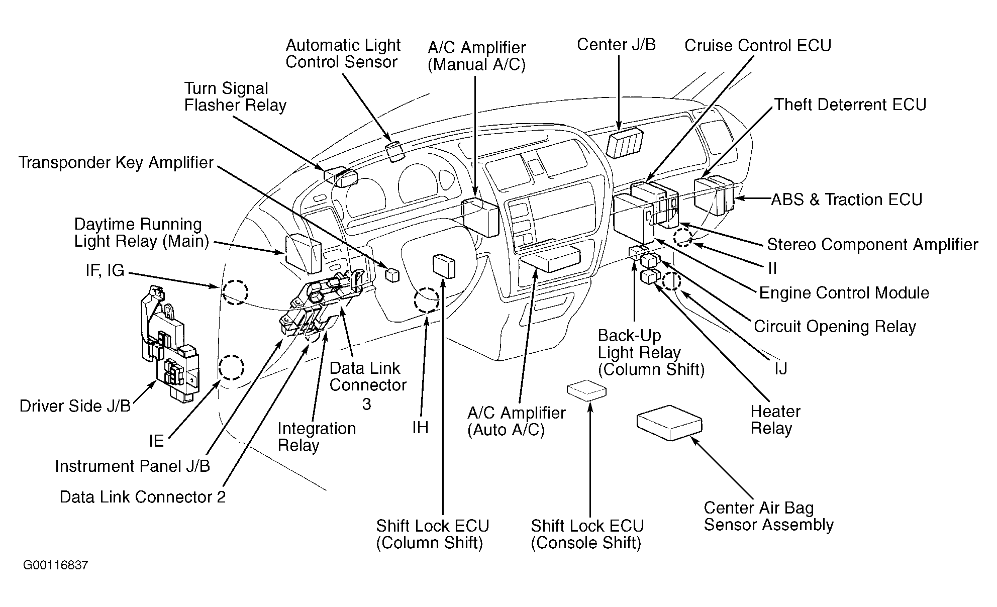 | A/C Amplifier | Behind left center of dash. See Figure. |