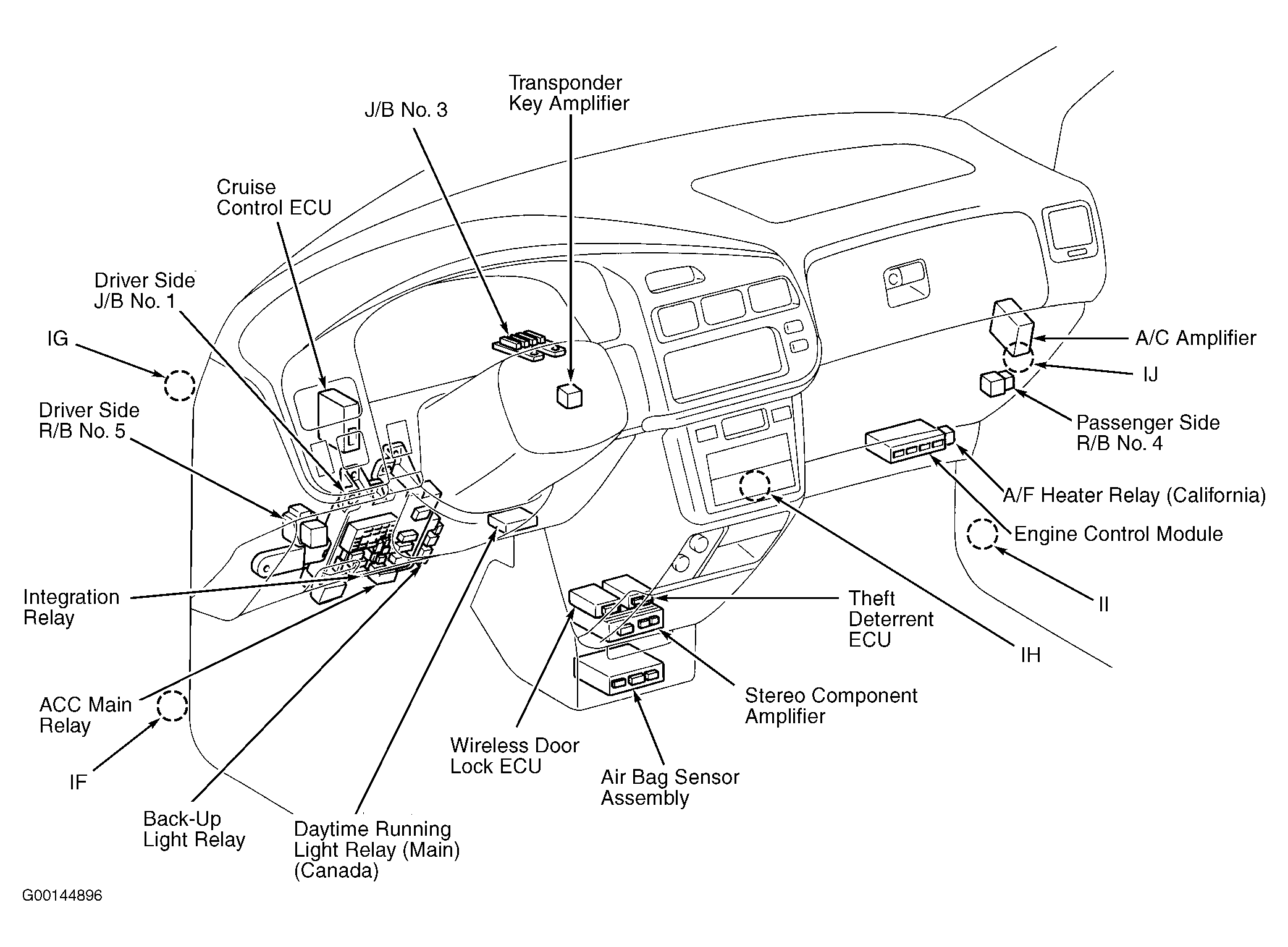 | Driver Side J/B No. 1 | Behind dash, left of steering column. See Figure. |