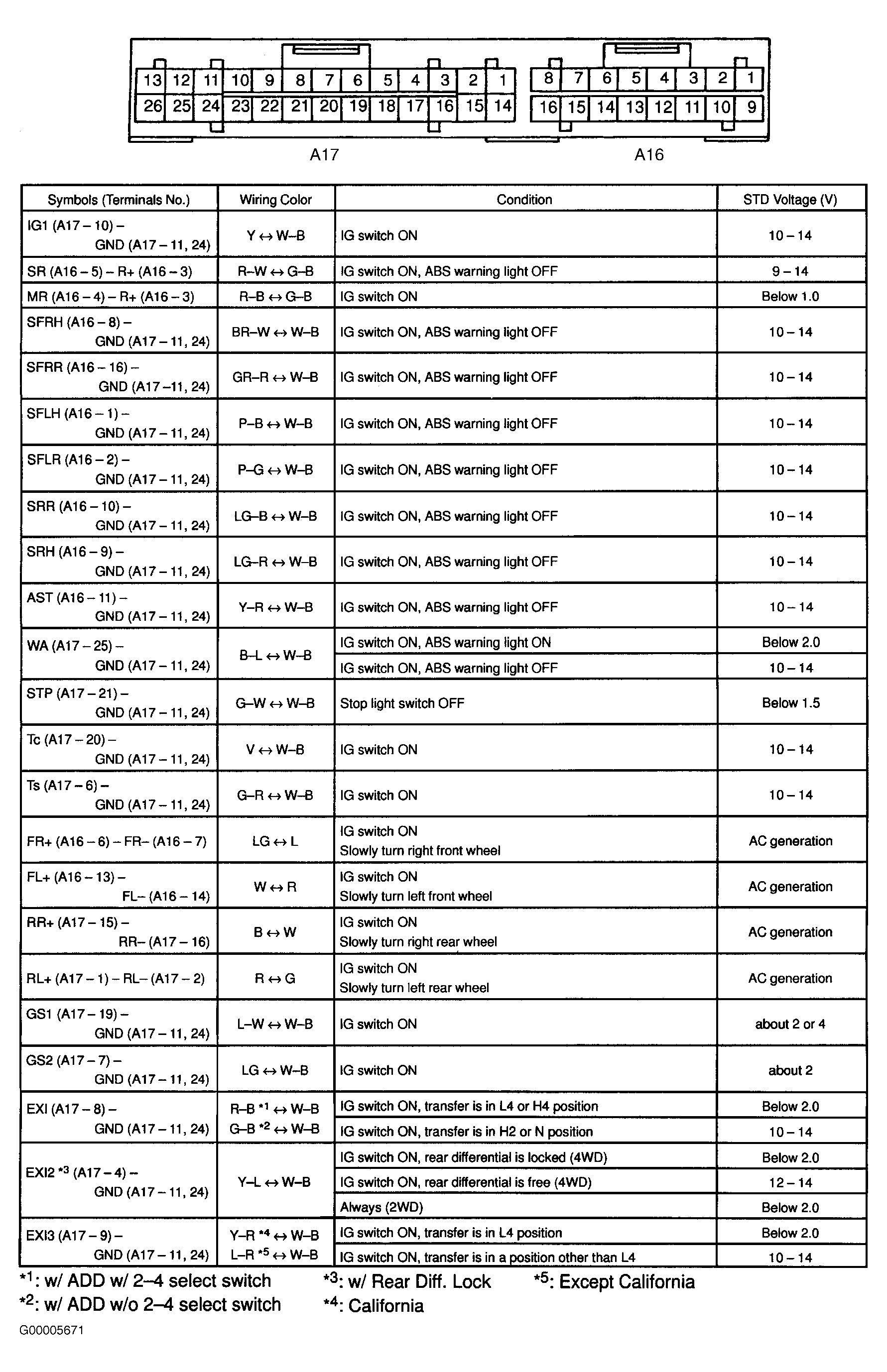 Components are tested with related circuit. See DIAGNOSTIC TESTS . ABS ECU values can be measured using Toyota hand-held tester and breakout box. ABS circuits and harness can also be tested by backprobing ABS ECU connectors and comparing measured voltages with ABS ECU standard values chart. See Fig 1.