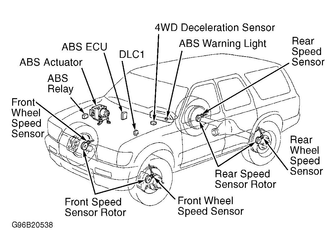 Anti-Lock Brake System (ABS) consists of hydraulic unit, actuator, solenoids, pump motor, ABS Electronic Control Unit (ECU), relays, deceleration sensor and wheel speed sensors. See Fig 1.