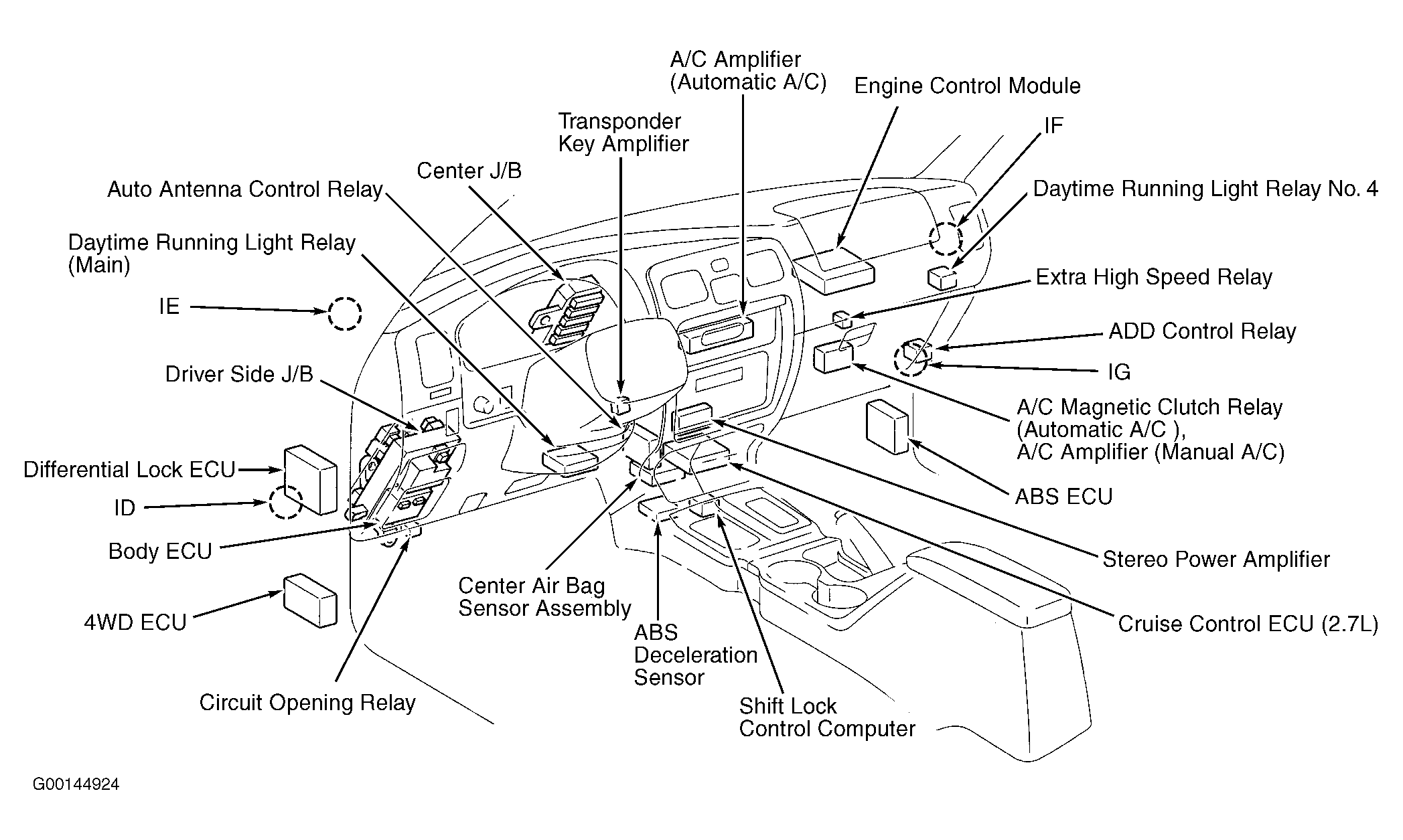 | Cruise Control ECU (2.7L) | Behind lower center of dash. See Figure. |