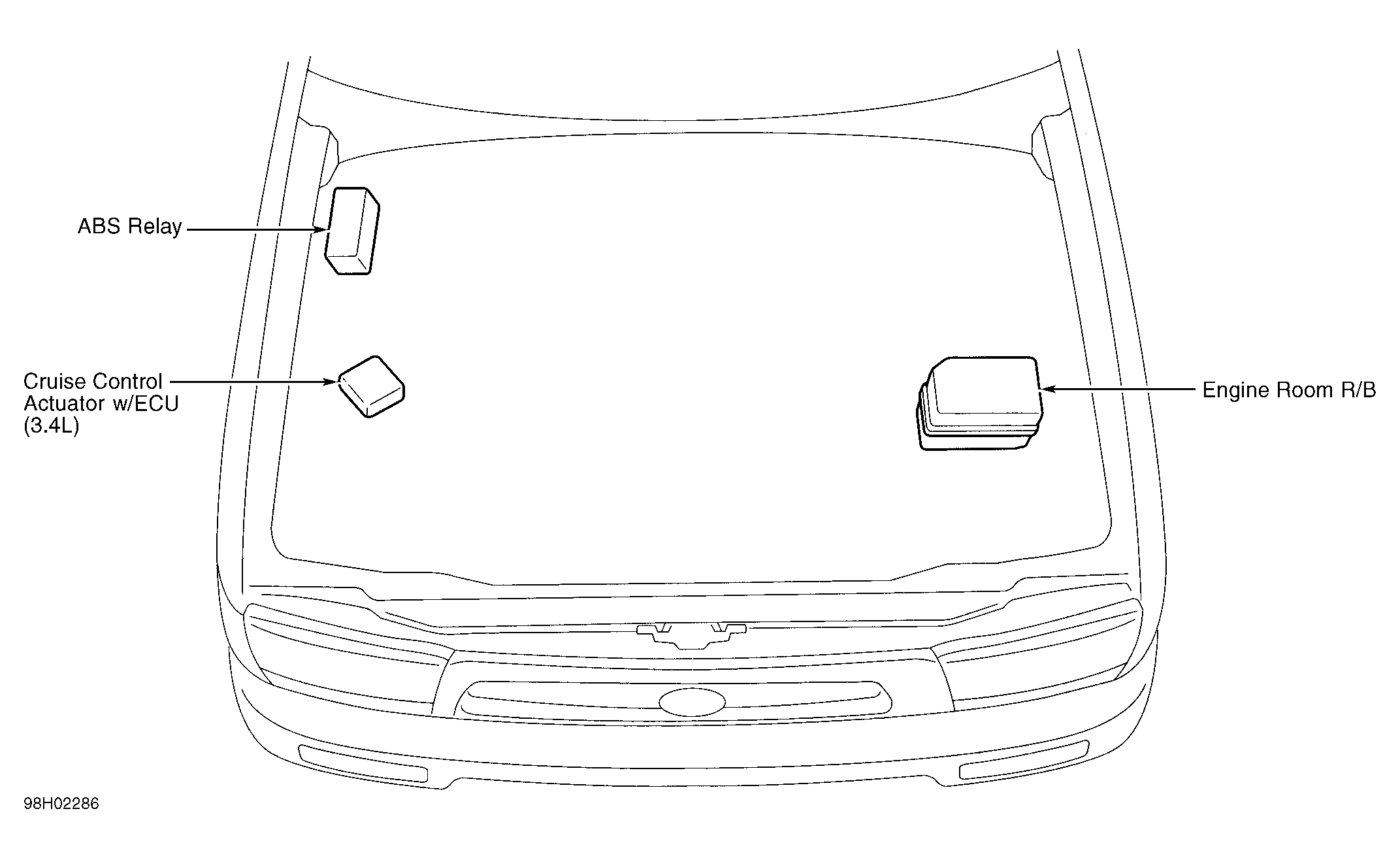 | Cruise Control Actuator W/ ECU (3.4L) | On right side of engine compartment. See Figure. |