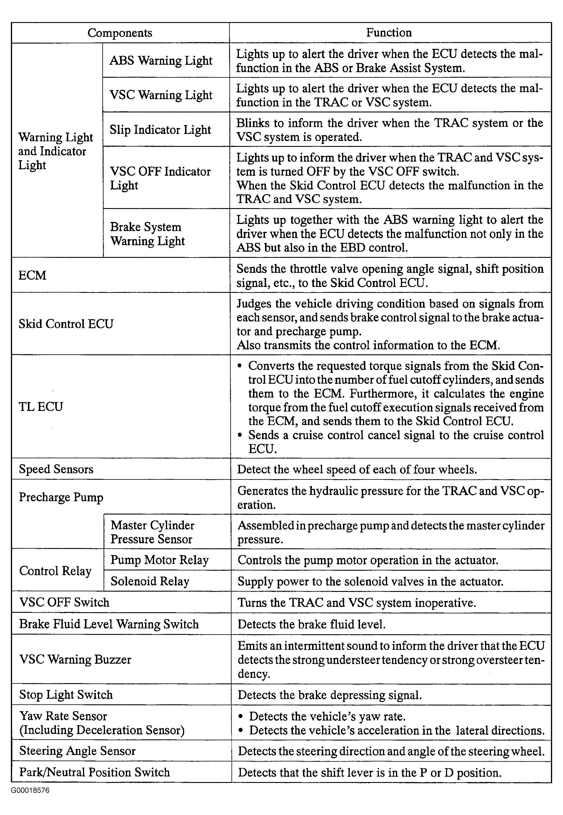 ABS/VSC system consists of a number of different integrated systems: Anti-lock Brake (ABS), Electronic Brake Distribution (EBD), Brake Assist (BA), Traction Control (TRAC) and Vehicle Stability Control (VSC). For a breakdown of individual system functions, see SYSTEM FUNCTIONS .