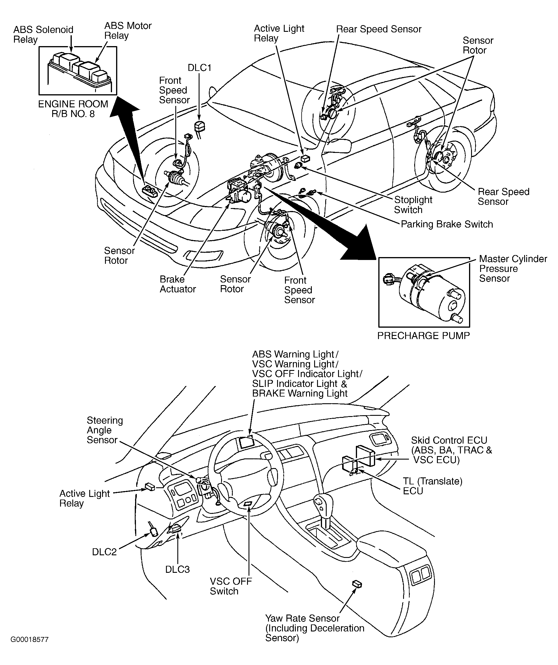 Each wheel has a speed sensor that feeds information back to Skid Control ECU. Under various conditions, brakes are applied or released through an ABS/VSC actuator. A solenoid relay and motor relay are used by Skid Control ECU to control operation of the actuator. For a complete ABS/VSC component description, see Fig 2.
