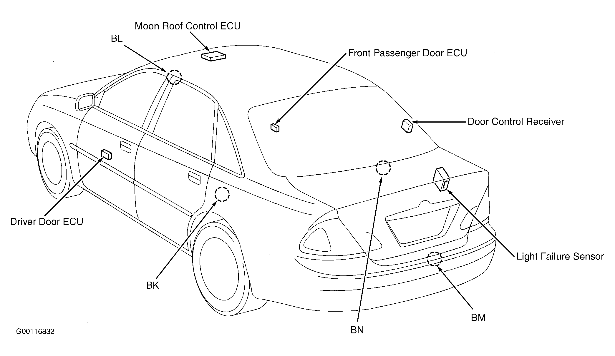 | Moon Roof Control ECU | In front center of roof. See Figure. |
