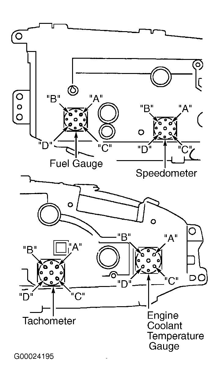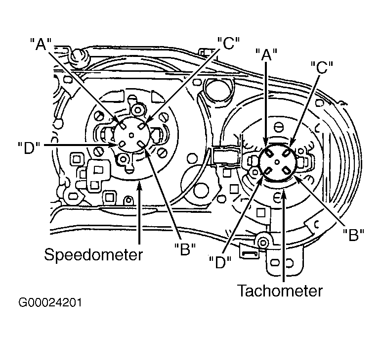 - Using DVOM, measure resistance between terminals "A" and "B", and between "C" and "D" while indicator is resting on stopper pin. See Figure, Figure and Figure . Resistance should be 250 ohms between each set of terminals. If resistance is not as specified, replace speedometer.