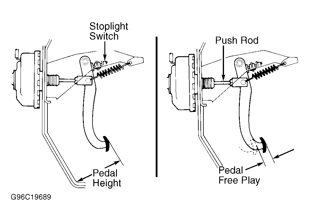 Stoplight switch is located above brake pedal. See Figure. To adjust stoplight switch, remove instrument panel lower finish panel. Loosen stoplight switch lock nut. Turn stoplight switch until clearance between switch and brake pedal stop is .02-.09" (.5-2.4 mm). Tighten lock nut. Check stoplight operation. Check brake pedal free play, see BRAKE PEDAL FREE PLAY .