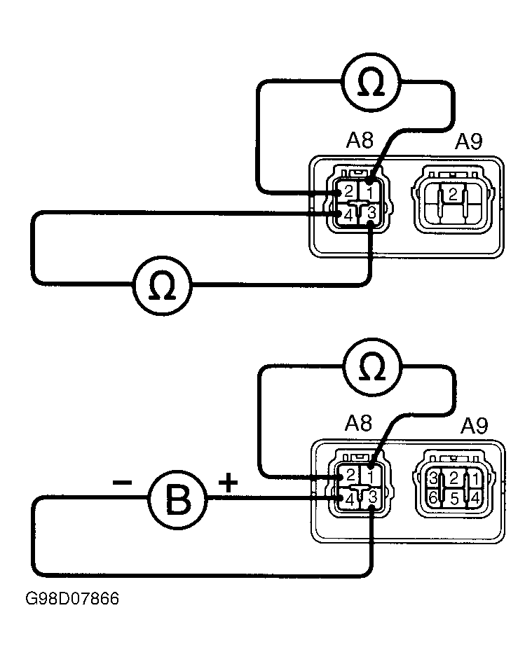 1. Check continuity between specified ABS control relay terminals. See Fig 1. Continuity should exist between terminals A8-3 and A8-4. Continuity should not exist between terminals A8-1 and A8-2. Measure resistance between terminals A8-3 and A8-4. Resistance should be 68 ohms. Replace motor relay if it does not test as described.