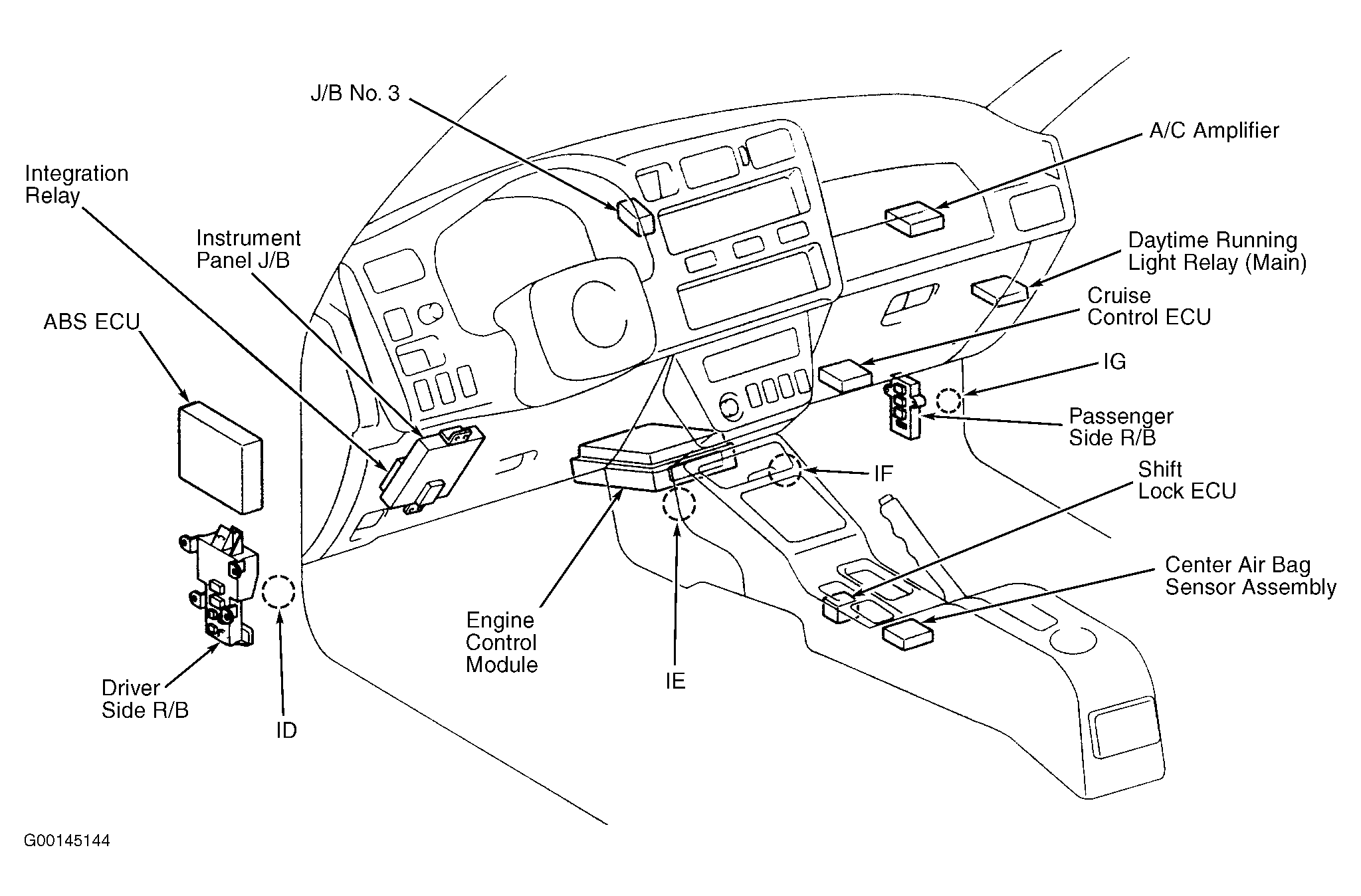 | Center Air Bag Sensor Assembly | Under center console. See Figure. |