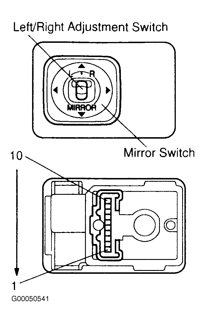 Remove power mirror switch. Using an ohmmeter, check continuity between appropriate mirror switch terminals. See appropriate POWER MIRROR SWITCH CONTINUITY TEST table. Continuity or resistance should or should not exist between specified terminals, depending on vehicle model. Check table foot note. If switch fails any test, replace switch. If switch passes continuity or resistance test, inspect switch circuit for defects or damage. See WIRING DIAGRAMS .