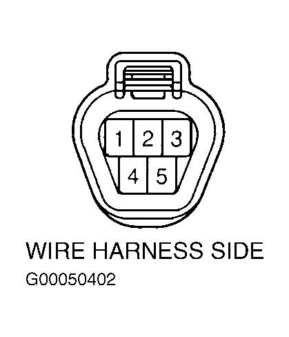 Disconnect 5-pin power window motor harness connector located in power window regulator assembly. Connect positive ohmmeter lead to connector terminal No. 2 and negative ohmmeter lead to connector terminal No. 5. See Figure. Connect positive battery lead to connector terminal No. 1 and negative battery lead to connector terminal No. 4. Ensure continuity exists when window goes up. Ensure no continuity exists when window is in fully closed position. If operation is not as specified, replace motor. See POWER WINDOW MOTOR under REMOVAL & INSTALLATION.