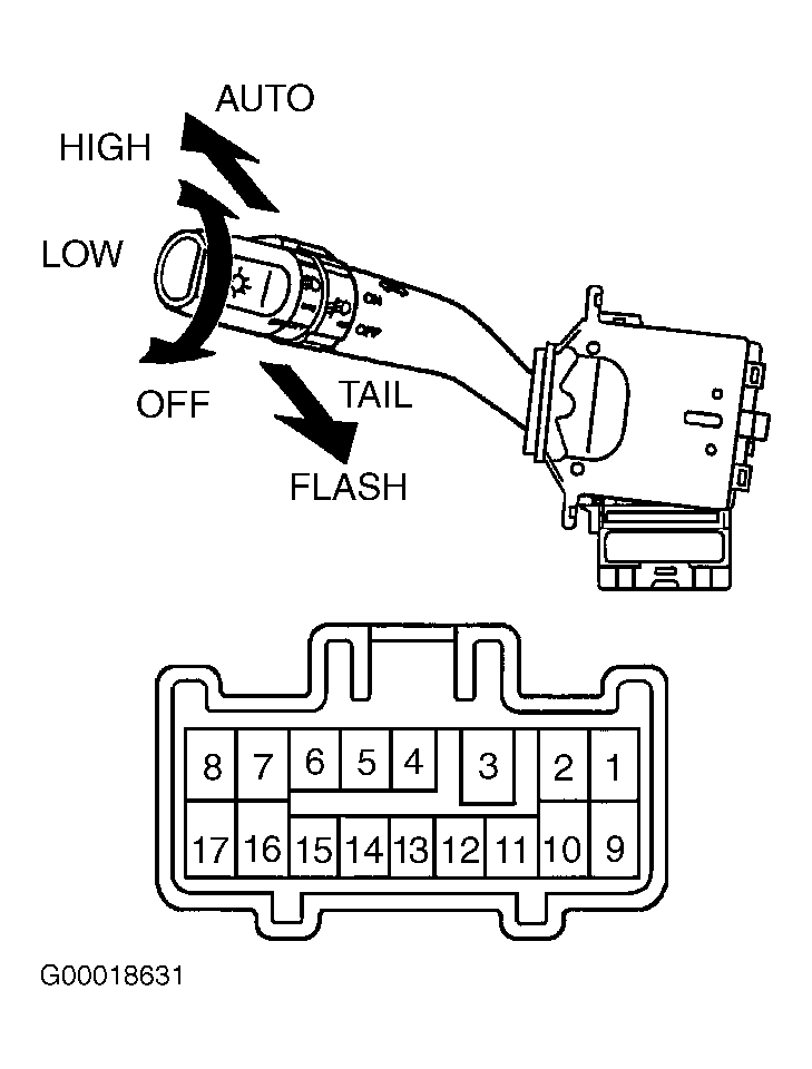1. Remove necessary steering column covers for access to headlight control switch. See Figure. Disconnect 17-pin electrical connector from bottom of headlight control switch.