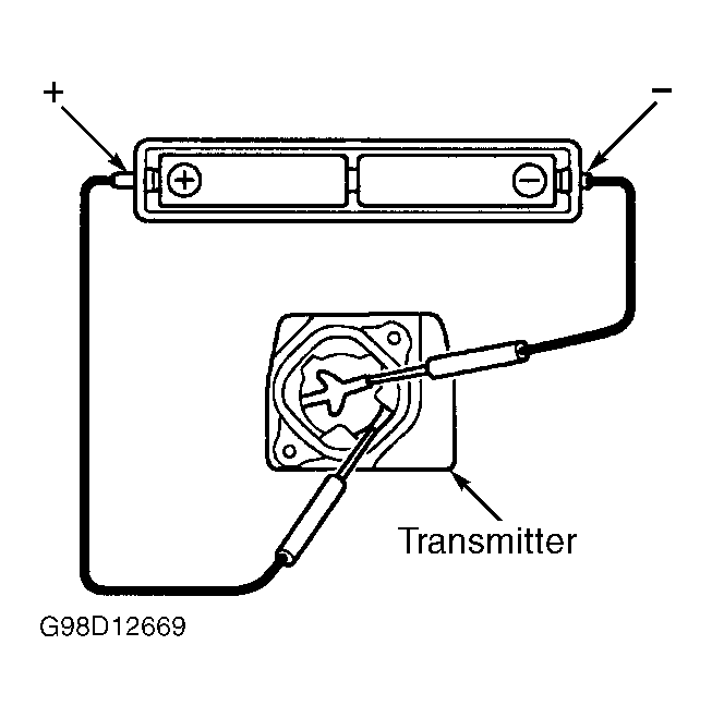 Open remote transmitter and remove battery. Replace with known-good remote transmitter battery of if not available, connect 2 new 1.5-volt dry-cell batteries in series. See Fig 1. Connect battery positive terminal to battery receptacle side terminal and battery negative terminal to bottom terminal in order to provide 3 volts to remote transmitter. Attempt to operate door lock by remote transmitter. If door locks operate, replace batteries. If door locks do not operate, replace remote transmitter. See REMOTE TRANSMITTER REGISTRATION under PROGRAMMING.