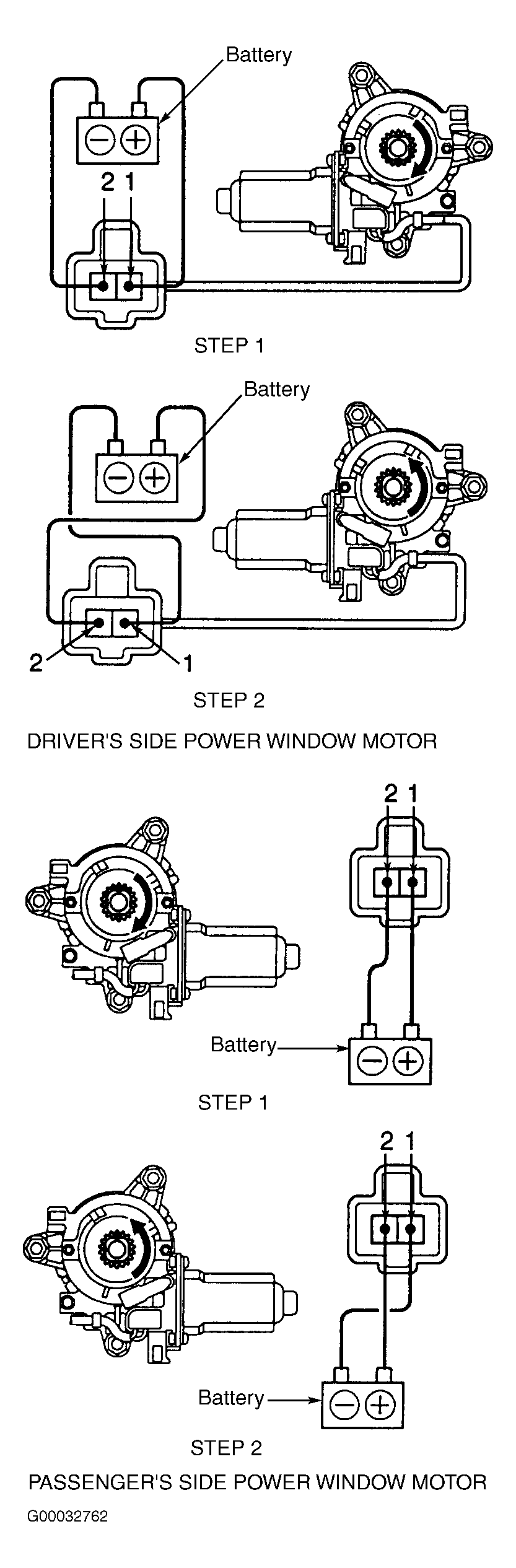 - Reverse jumper wires so polarity is reversed and check that power window motor rotates counterclockwise. Perform STEP 2 in illustration. See Fig 1. Replace power window motor if operation is not as specified. See POWER WINDOWS - CARS article.