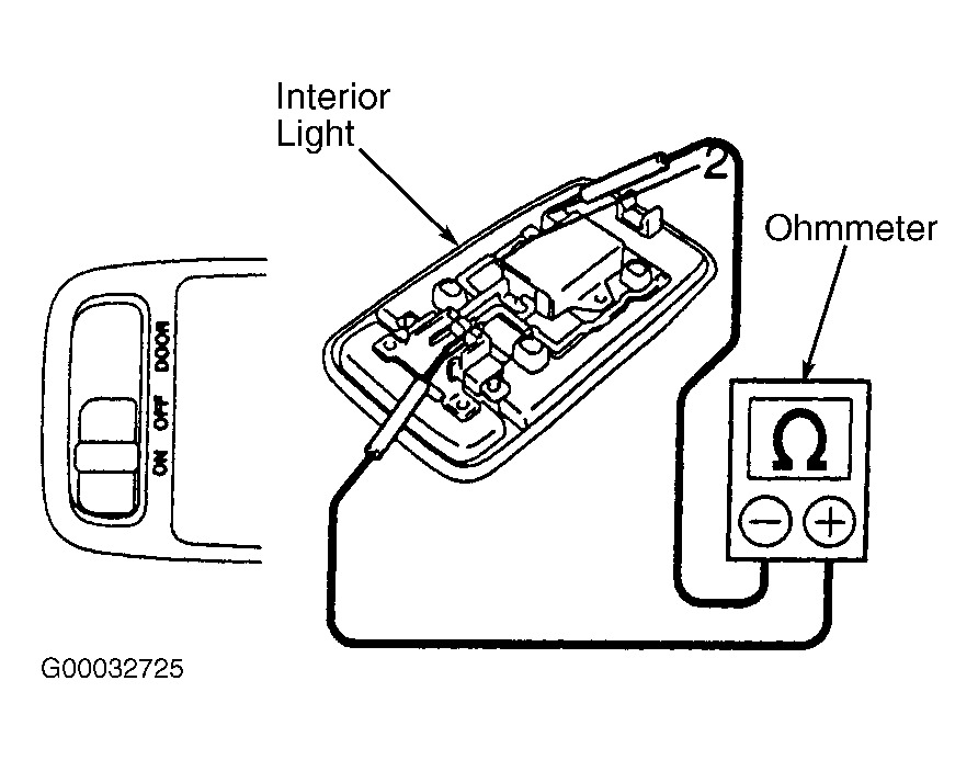 - Using ohmmeter, check that continuity exists between body ground and electrical terminal on light assembly with light switch in ON position. See Fig 1. Replace bulb or interior light assembly if continuity does not exist.
