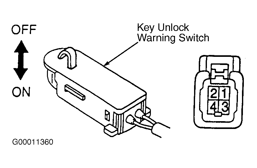 - Disconnect electrical connector for key unlock warning switch. Key unlock warning switch is located on upper steering column bracket, near ignition lock cylinder.See Figure. Key unlock warning switch may also be referred to as unlock warning switch.