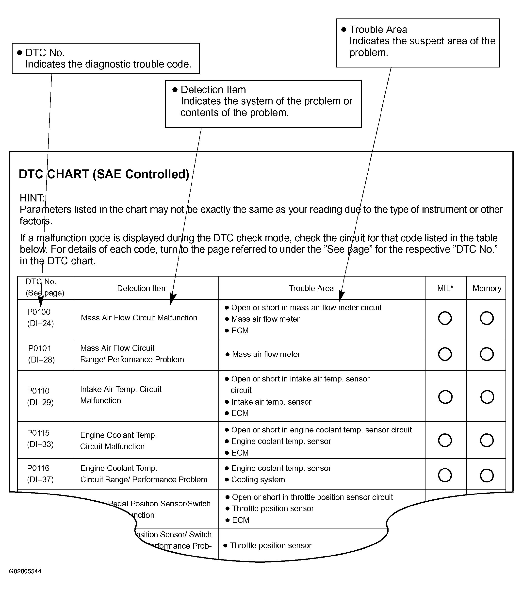 The inspection procedure is shown in Fig 7. This table permits efficient and accurate troubleshooting using the diagnostic trouble codes displayed in the diagnostic trouble code check. Proceed with troubleshooting in accordance with the inspection procedure given in the diagnostic chart corresponding to the diagnostic trouble codes displayed. The engine diagnostic trouble code chart, see Fig 7, is an example.