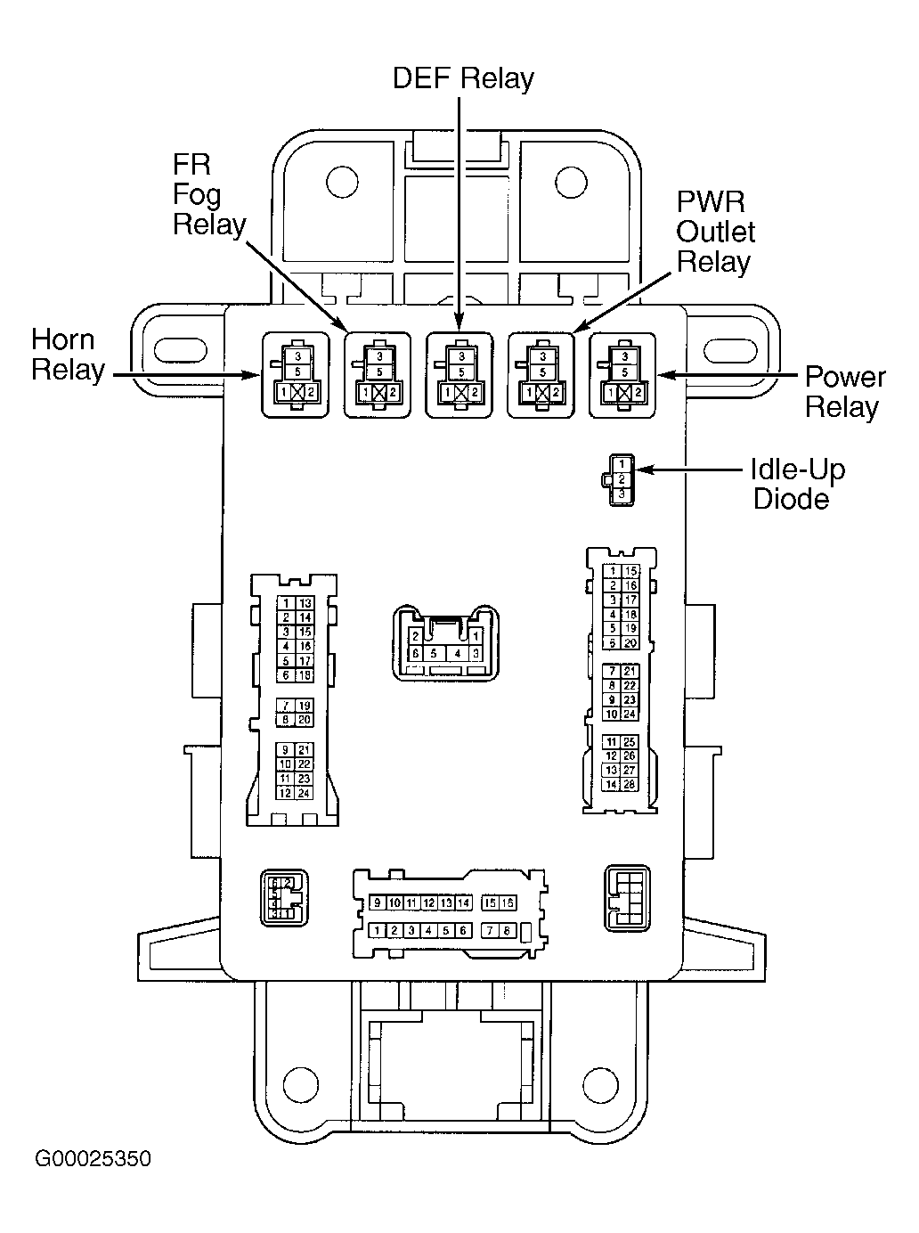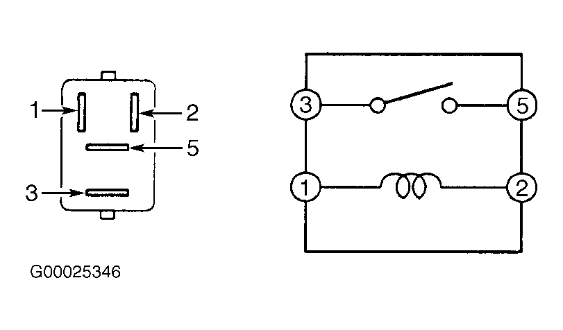 2. Note identification of electrical terminals on power relay. See Figure. Using ohmmeter, check that no continuity exists between terminals No. 3 and 5 on power relay. Check that continuity exists between terminals No. 1 and 2 on power relay.