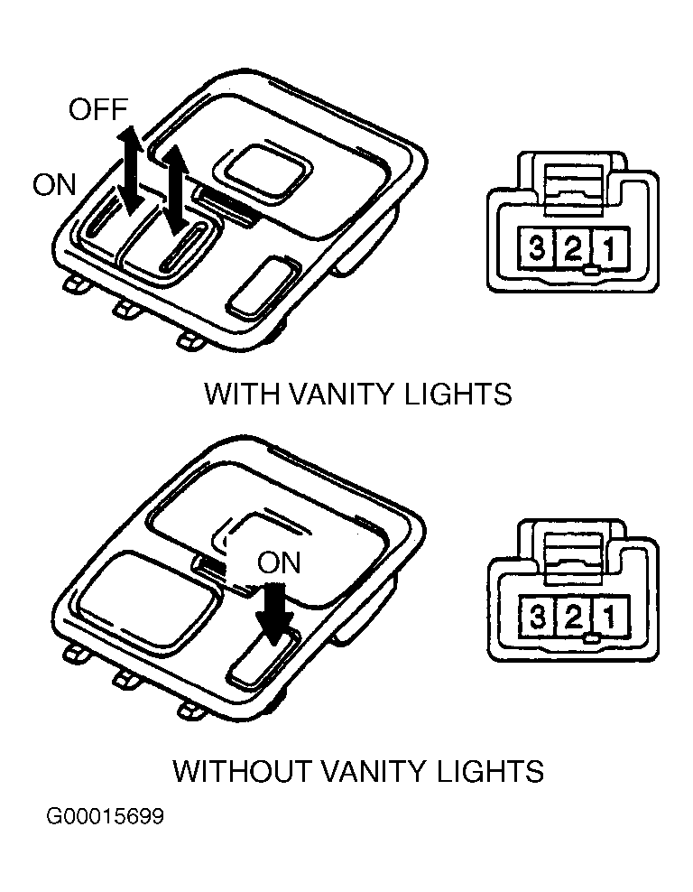- Using ohmmeter, check that continuity exists between terminals No. 1 and 3 with switch on front interior light in ON position. See Fig 1. Check that continuity exists between terminals No. 2 and 3 with switch on front interior light in DOOR position. See Fig 1. Replace switch for front interior light if continuity is not as specified.
