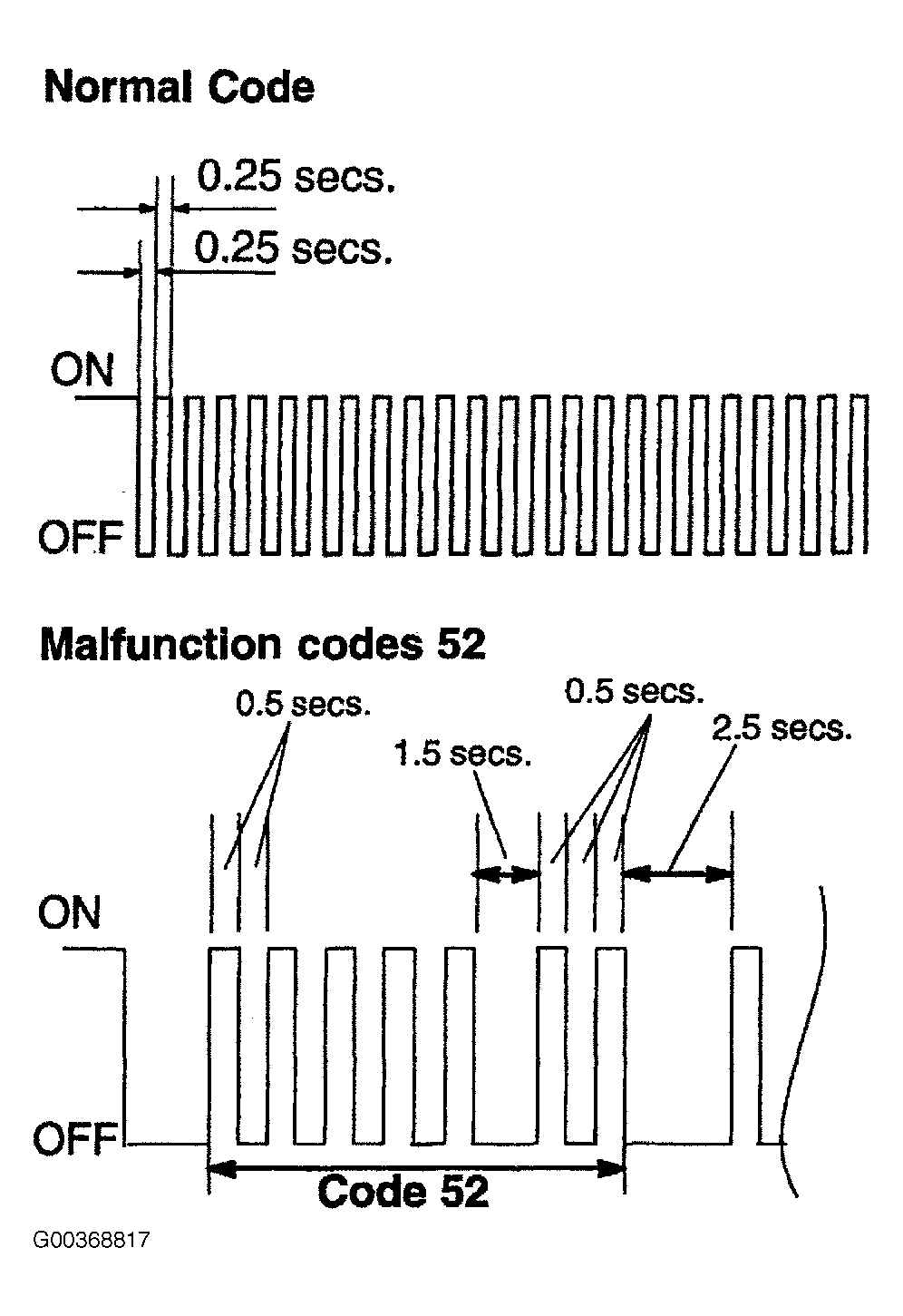 NOTE: If The DTC is not output, inspect the diagnosis circuit. See DIAGNOSE SYSTEM.As an example, the blinking patterns for codes; normal, 11 and 21 are shown in the illustration. See Figure.