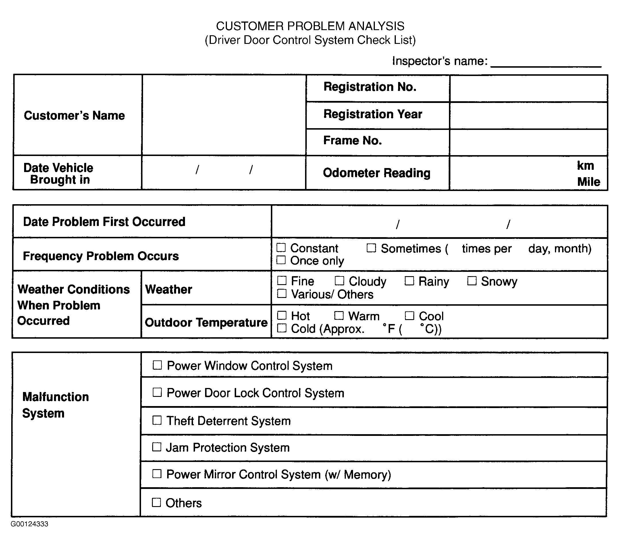 - Trouble shooting of a driver door control system complaint begins with verification of the customer problem. Perform Customer Problem Analysis (Driver Door Control System Check List). See Fig 1. If problem occurs, go to step 3. If problem does not occur, go to next step.
