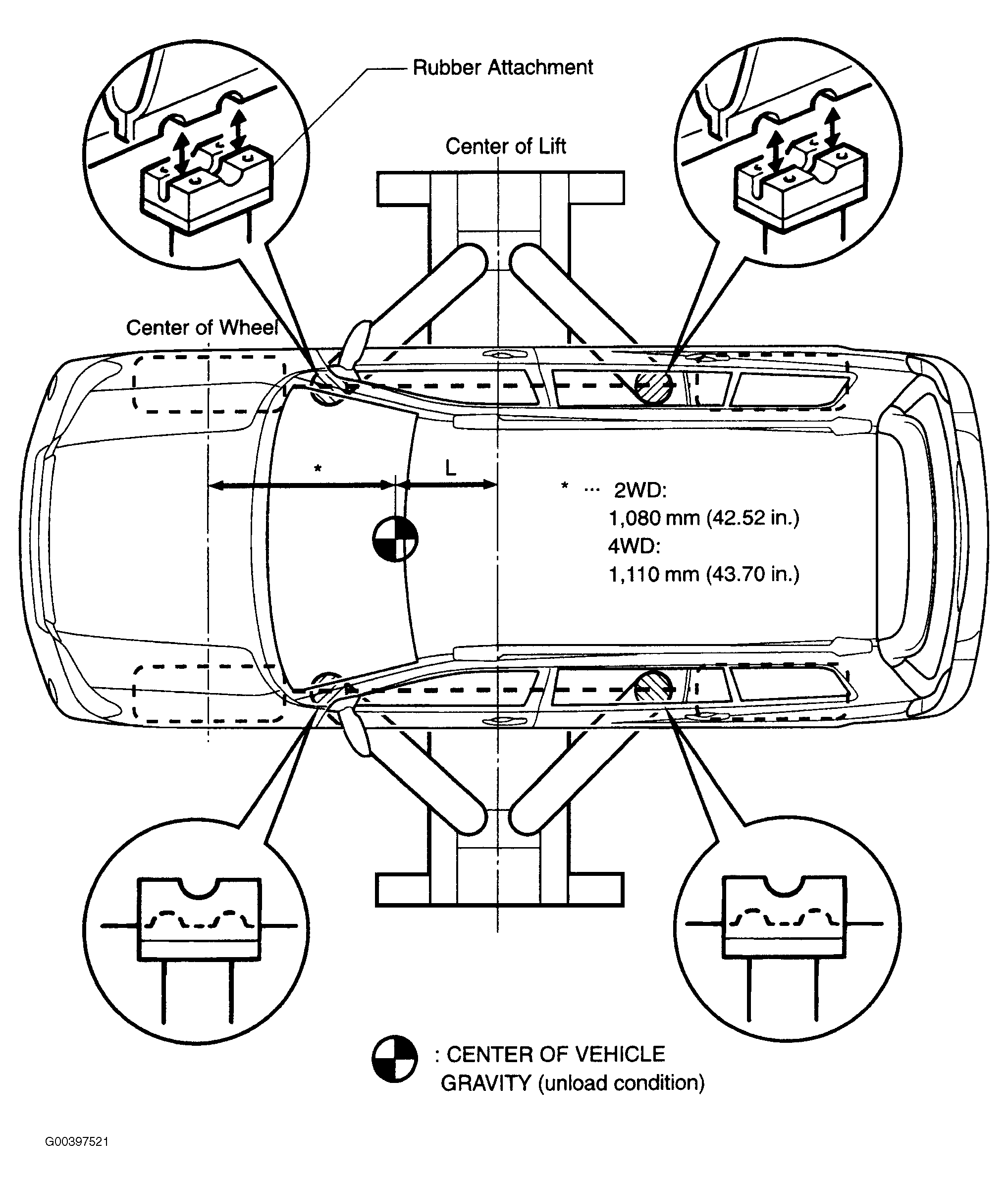 2. When removing any parts of heavy weight like the engine and transmission, the center of gravity of the vehicle moves. Place a balance weight so as to keep it from rolling, or hold the jacking support location using the mission jack.