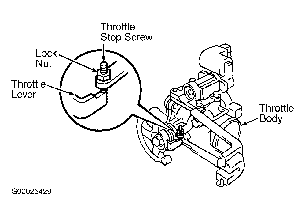 3. Loosen lock nut on throttle stop screw. See Fig 1. With clearance between throttle stop screw and throttle lever, hold throttle fully closed and tighten throttle stop screw until it just contacts throttle lever. Once throttle stop screw contacts the throttle lever, tighten throttle stop screw an additional 1/4 turn and then tighten lock nut. Ensure Throttle Position (TP) sensor operates properly after performing this procedure. See THROTTLE POSITION SENSOR  under ENGINE SENSORS & SWITCHES.